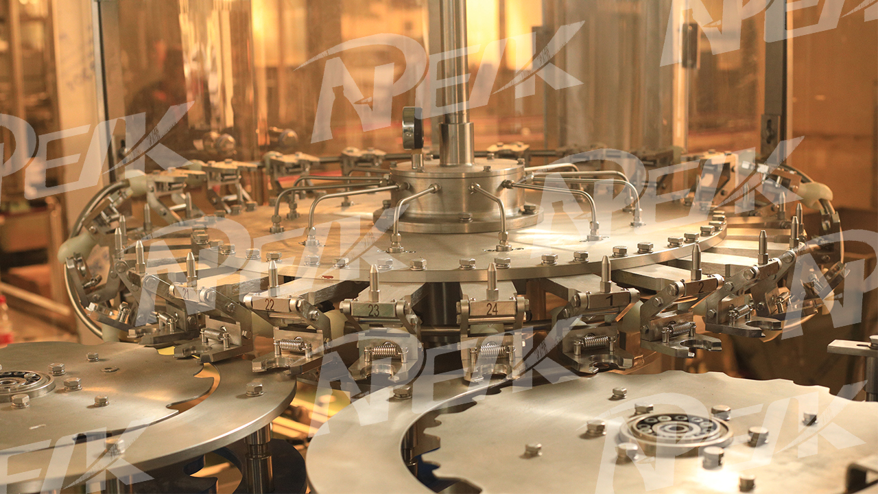 灌裝時(shí)瓶子采用機(jī)械,高速運(yùn)行平穩(wěn) 。瓶口在機(jī)械作用下上升后與灌裝閥密封,然后開(kāi)始灌裝。當(dāng)灌裝設(shè)定液位后,灌裝閥進(jìn)行二次關(guān)閉,灌裝液位準(zhǔn)確,灌裝結(jié)束(灌裝結(jié)束后脫開(kāi)時(shí)的噴料現(xiàn)象污染瓶口)